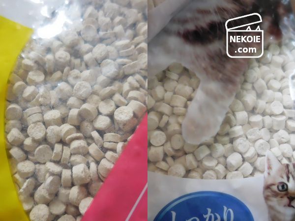 この錠剤のような形の砂が画期的で、多少飛ばされても転がりにくいので掃除が楽。それでいて粒が小さめ(市販品の中では中くらい?)なのもあってか、現状わが家では嫌がる子もいません。
