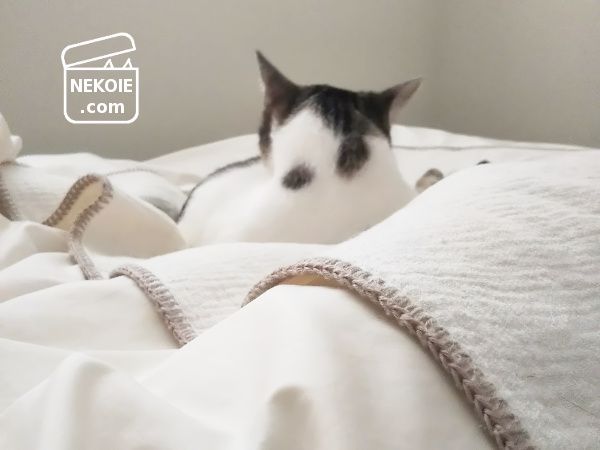私のベッドのほぼ中央で寝ている弟猫。実は私も起きた直後に撮影したのですが、つまりは、私が「寝床の端っこ」に追いやられていたということ。