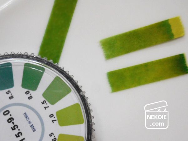 でも実際に色の変化を感じられない状況で、それが「正常値」なのか「試験紙の異常(劣化)」なのかの判断が以前の私にはつきませんでした。それを明らかに液性がわかっているものに浸して定期チェックをしておくことで、少しだけわかりやすく、安心できるようになりました。