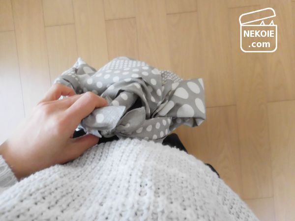 メインのバッグの中にしのばせておき、出先で用途や形を変えて使うことも可能。私は四つほど結び目をつくり、小さめの巾着として使うことが多いです。