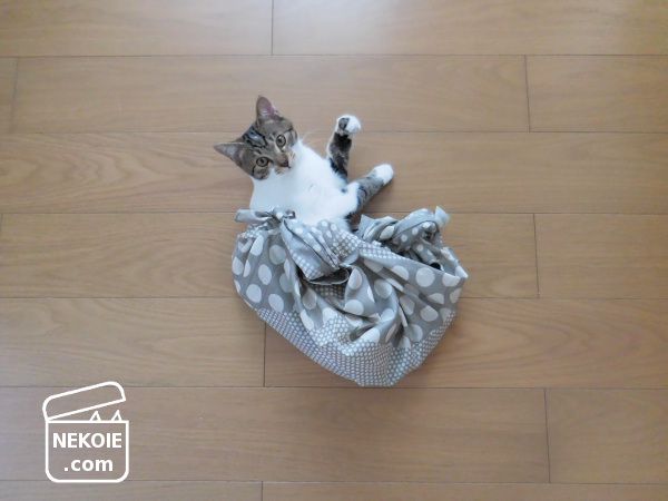今回の風呂敷を買い足したのは、子猫を迎えてすぐのことでした。もっと小さい布、お弁当箱を包むような小風呂敷にでも収まってしまいそうなサイズのちびっ子でしたが、今やこう。
