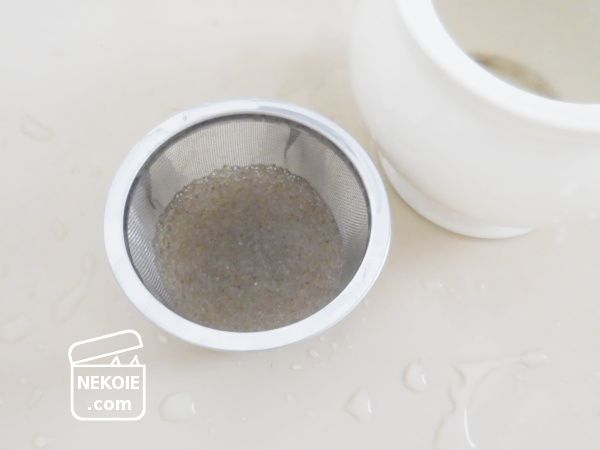最初の「すすぐ」という段階でも、この茶こし以外が使えないため、十数回のくり返しが必要になるのでした。ビーズを通さないほど目が細かく、それでいて容量の大きいざるというのがわが家にはないため。