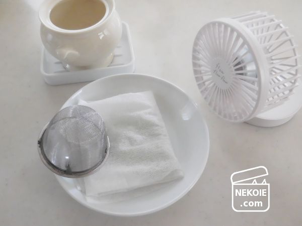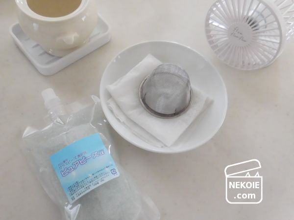 相性の良い茶こしについても、この用途のために持っているものは一つしかありません。それを使ってビーズを乾かすと、その間はお線香立てが使えないことに。加えてビーズを広げて乾かすにはどうにも小さすぎるサイズ。
