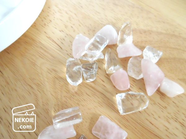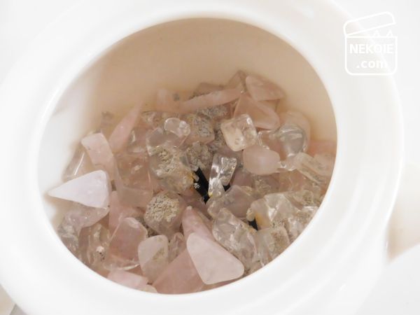 そこで代用品に選んだのが、こちらも過去に多用途に使ってきたローズクォーツのさざれ石。これをシュガーポットの中に入れて、お線香を固定する香炉灰の代わりとしたところ、問題なく立てることができました。