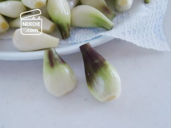 これまでのらっきょうはほぼ真っ白になるまで皮を剥いていたのですが、今年はやや手前で止めてみることに。