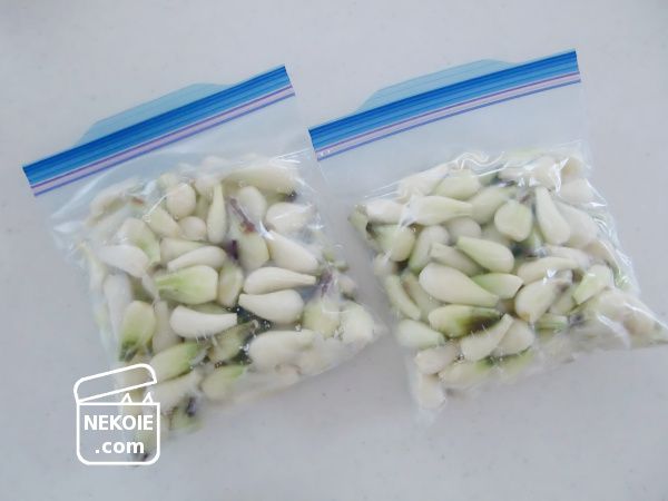 そんな経験則の一つとして、容器(樹脂のパッキン)に残るにおいが強烈であることを学んだので、らっきょう漬けには使い捨てのフリーザーバッグを使うようになりました。