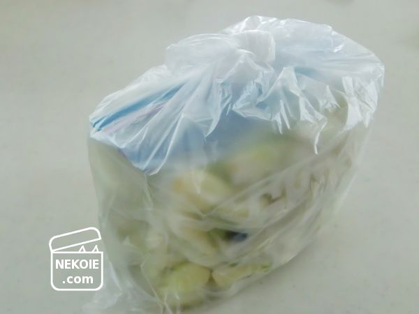 ジップロックのおかげでだいぶにおいは遮断できるのですが、水分漏れの心配もあるのでもう一袋かぶせることに。