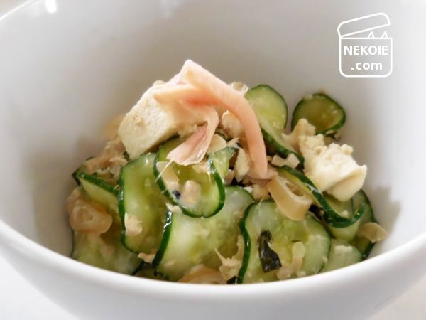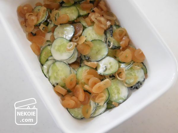 最近たくさんいただけるのが、きゅうり(わが家では夏に買う必要がなくなってしまう野菜)。それをスライサーにかけたものと混ぜるだけでも一品できます。