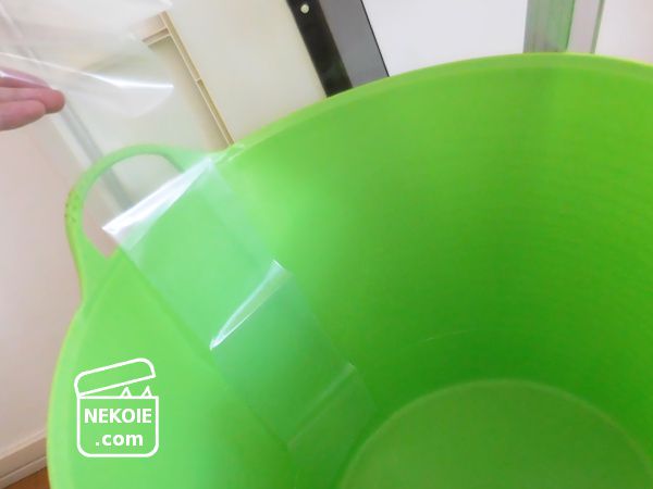 - ここまでの大がかりな養生は必要なかったかもしれません。少なくともバケツはまったく濡れませんでした。ただ素人である私の作業では多少スプレーが飛んだり垂れたりしたので、都度ウエスなどでしずくを抑えたり、後から壁や床を拭いたりする必要はありそう。私は今後も、今回と同じ方法で養生します。