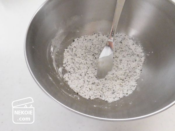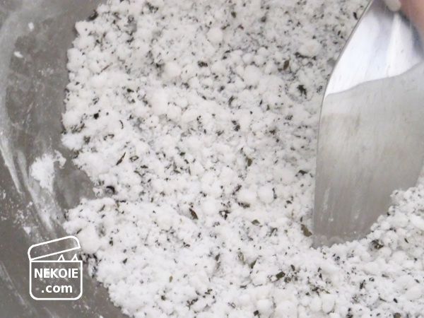 まずは粉砂糖とコーンスターチ、二種類の粉末をしっかり混ぜ合わせ、そこに少量のレモン果汁を加えて更に混ぜます。水分を加えるとダマになり始めますが、それを崩しながらパン粉のような状態に。