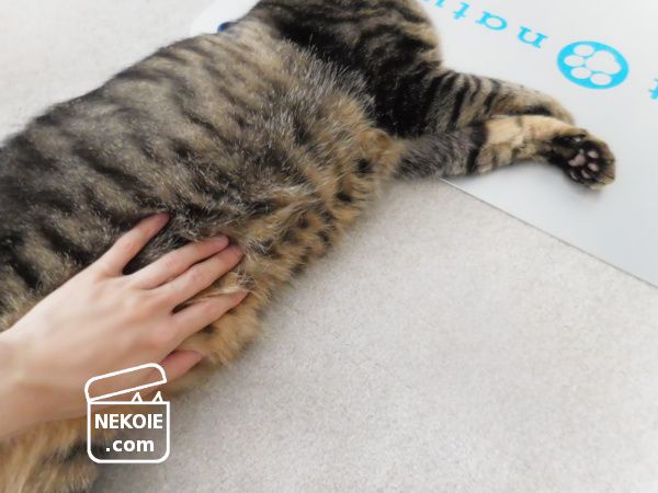 私の前までやってきて、ぱたりと倒れ「さわってくれ」ポーズの兄猫。