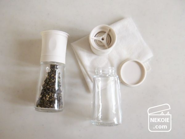 手持ちのミルつき瓶は、五年程前に数種類の粒胡椒を入れるために買ったもの。同じものを二本手に入れ、一方には常に黒胡椒を入れているけれど、もう一方はその時々で手に入れた他色の胡椒や岩塩などを入れていました。