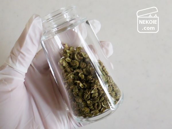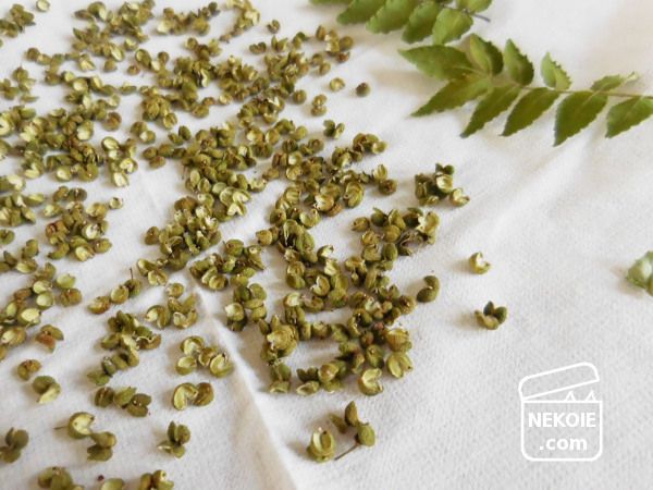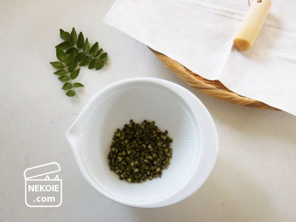 ネットでレシピを調べると「収穫直後につくったほうがいい(乾燥は電子レンジやフライパンで煎るなどして時短させる)」という情報も多かったのですが、もともと私に粉山椒のつくり方を教えてくれた知人が自然乾燥でも問題ないというので倣いました。