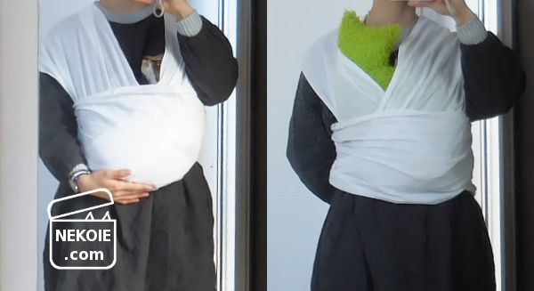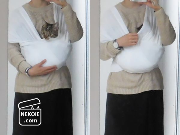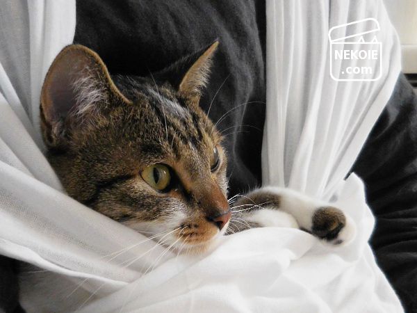 などの失敗をくり返しましたが、最初の一週間ほどでようやく慣れてきました。長い生地なので屋外でささっと結ぶのは難しそう(地面についてしまいそう)ですが、一ヶ月もしたら「結び始めて猫を収めるまでの作業」に一分もかからなくなりました。