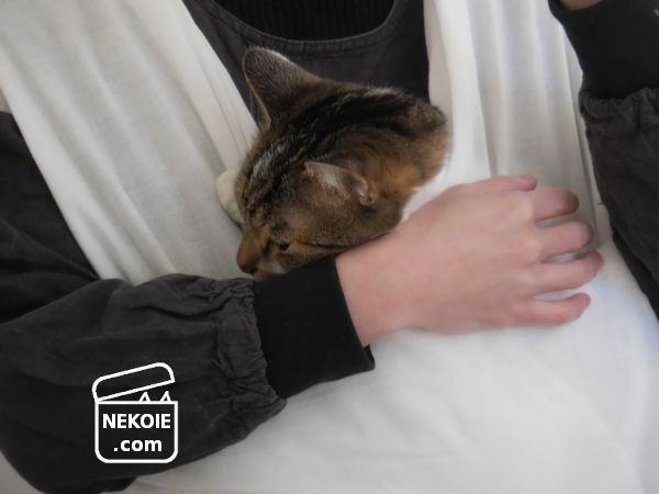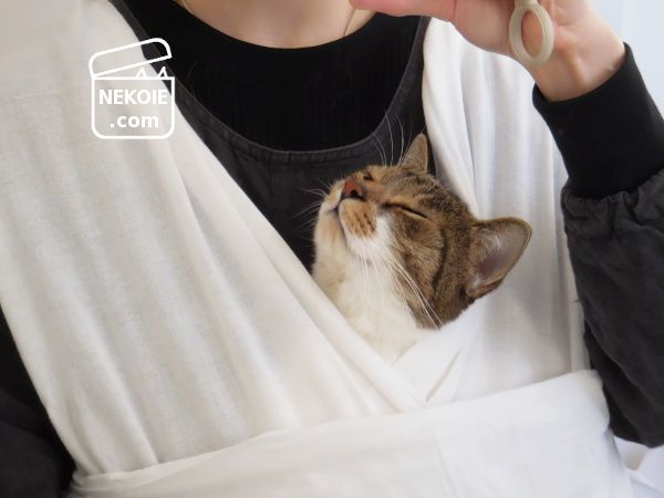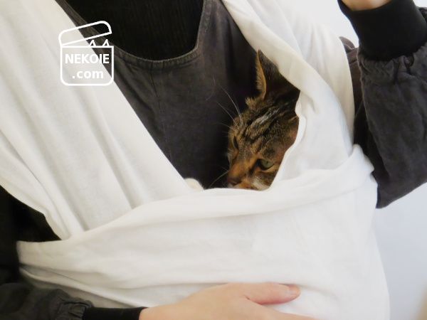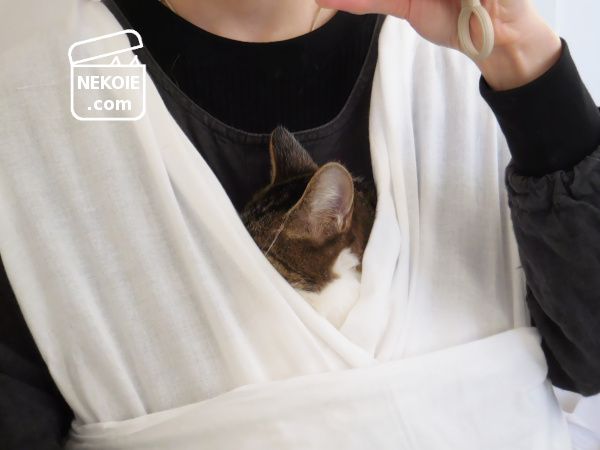 市販の人間の赤ちゃん用抱っこひもを試したこともあるのですが、一番安上がりで、一番お手入れが簡単で、一番安定するのが木綿さらしを切っただけのものでした。猫の軽さも理由になるかもしれません。10m千円ほどで買ったものを半分くらいに切って使っています。