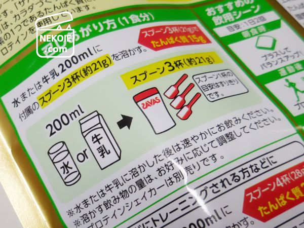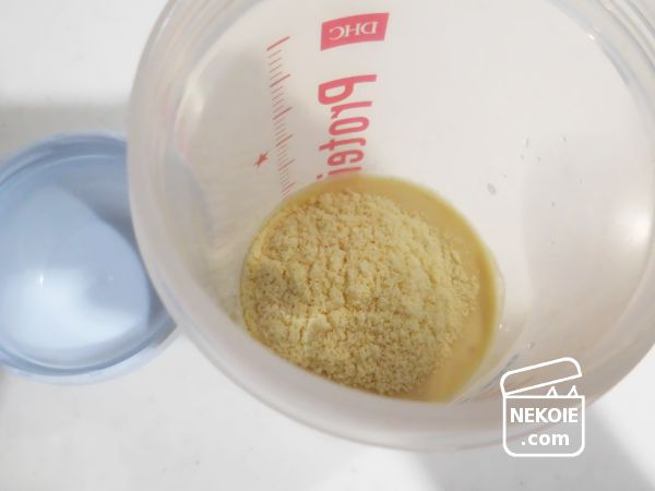 先に規定量の水を注いでおいたシェイカーに、スプーンですりきりの粉を三杯(たんぱく質15g)。
