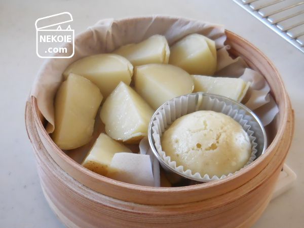 この日の蒸しパンのふくらみは今一つ。でもじゃがいもはほくほく。私は芽の部分だけを最初に取り除き、新じゃが以外(ちょっと硬め)の皮も大半を残したまま蒸して丸ごと食べてしまいます。煮崩れのようなことがないので食べやすさでも大好きな調理方法でした。