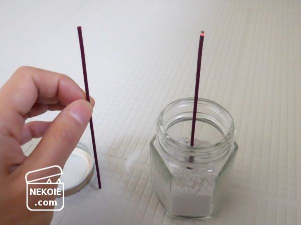 耐熱性のあるジャム瓶でもお線香が放つ高温は心配でしたが、平時であれば一番高温になる(赤くなった)先端がガラスに触れることはないので、注意しながら採用しました。