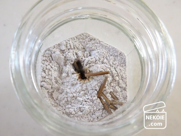 これは以前にもご紹介したことのある、立てたお線香の燃え残りが少ない香炉灰。それを空のジャム瓶に入れて使うことに。