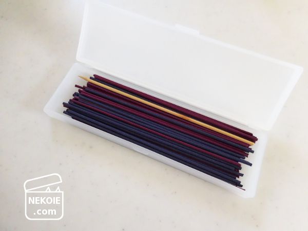 その竹串はバスルームで使うお線香(煙あり)やライターといっしょに、無印良品のペンケースで保管しています。
