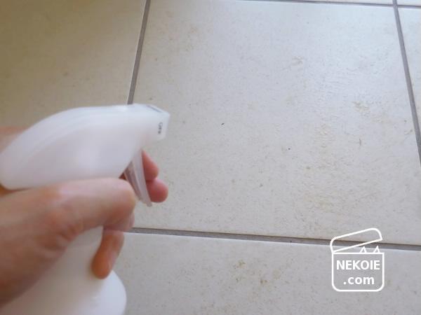 ほうきでの掃き掃除を終えたタイルに直接スプレーし、しばらく放置。その間に扉やドアノブを拭いたり、他の家事を済ませます。