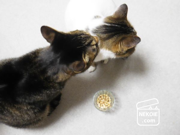 以前は猫にも小さく砕いた福豆をあげることがありました。ただ煎り豆はあまり消化によくないとのことで、ここ数年は控えています。