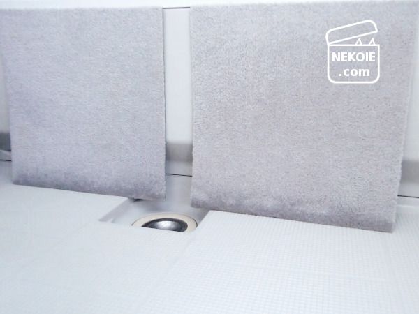 あとは改めて立てかけたり浴槽のふちにひっかけたりして、扇風機で風をあてながら翌日まで干しておくだけ。