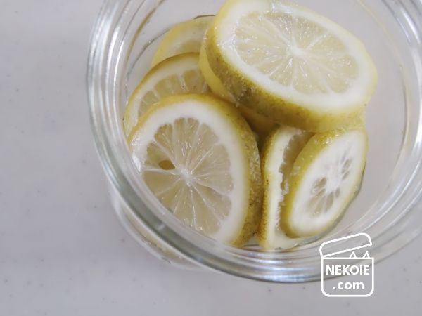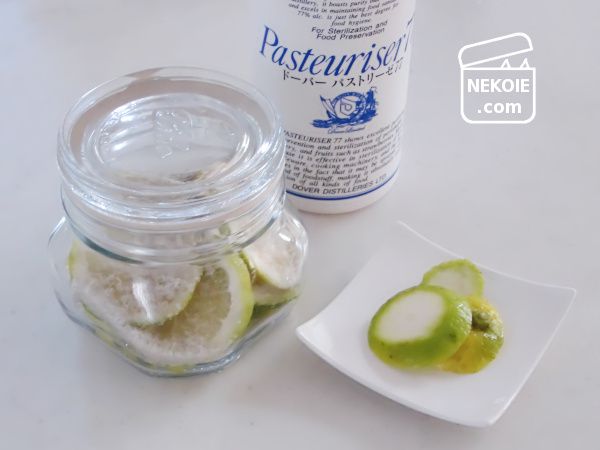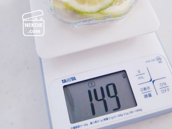 瓶は事前に熱湯消毒、レモンはアルコール消毒しました。そのレモンは好きな形に切って(今回はスライス)、皮のまま計量。