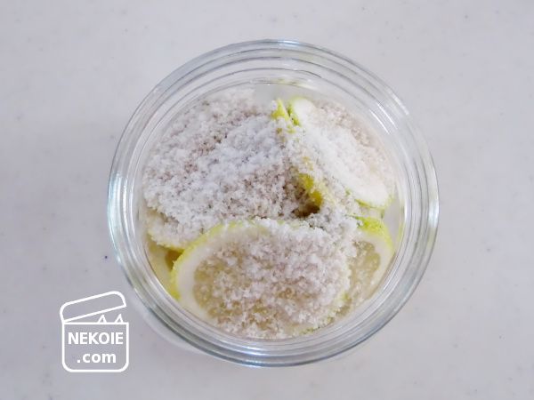 本来なら塩、レモン、塩、レモンと層にしていくのが理想的だと思いますが、そうできるほどの量はありません。軽く塩をふった瓶の中にレモンを入れ、残りの塩をまぶす方法で仕込みました。