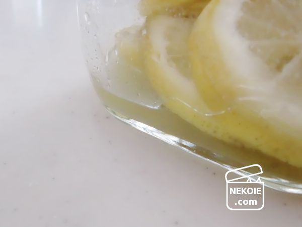 - レモンをうつわに入れ、かぶる程度のお湯を注ぐ。