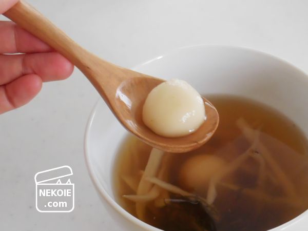 冷凍白玉だんごを食べるときは事前に自然解凍させておくか、軽くゆで直すだけ。あんことあわせて甘味として楽しむのは鉄板ですが、私はあったかいスープに入れるのも好き。