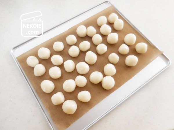 粗熱がとれた白玉だんごはすぐに食べるぶんだけ取り分けて、残りをオーブンシートの上にくっつかないよう並べて冷凍室へ。