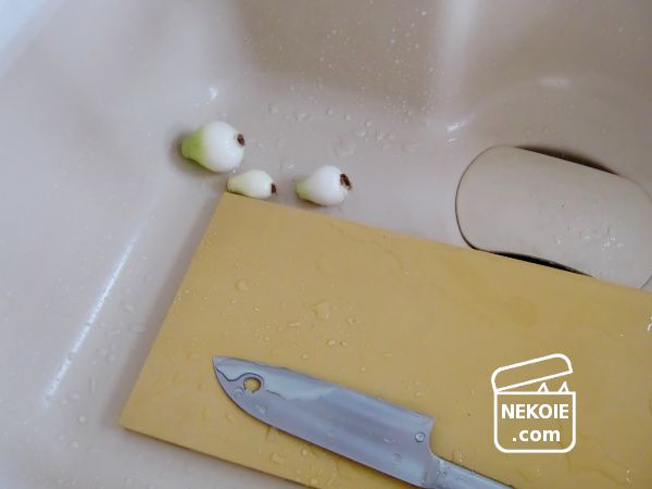 玉ねぎの皮ならこれまでにもシンクの上で剥くことは多かったけれど、きれいにはがした後も根っこの部分についた土でワークトップを汚すのが日常的でした。それなら完全にカットがすむところまではシンクで終えてしまおうかなと。