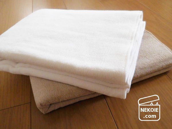 こちらもあまり見かけない「日本製」のマイクロファイバー。バスタオルですが、ひざ掛けとして使っています(湯上りはフェイスタオル派)。