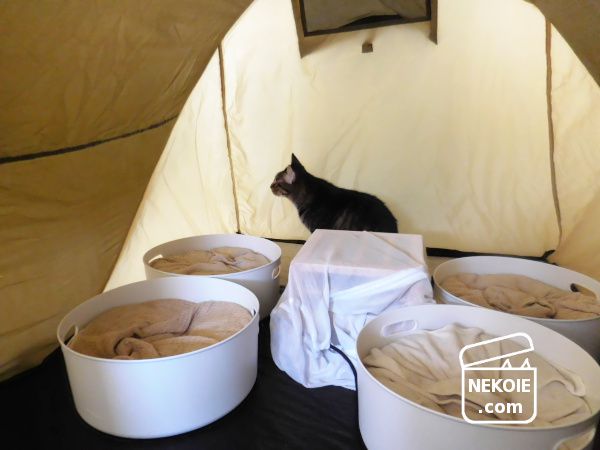 朝になって目が覚めたとき、周囲の猫たちのベッドは完全に空っぽになっていました。そしてテントの中にいたほとんどの子が私に寄り添った状態でぐっすり。毛布の中にいる子も、外にいる子も、私の体にぴったり。毛布一枚だと朝方は寒いかもしれない? という心配もしていたはずが、どうりで暖かいはずです。