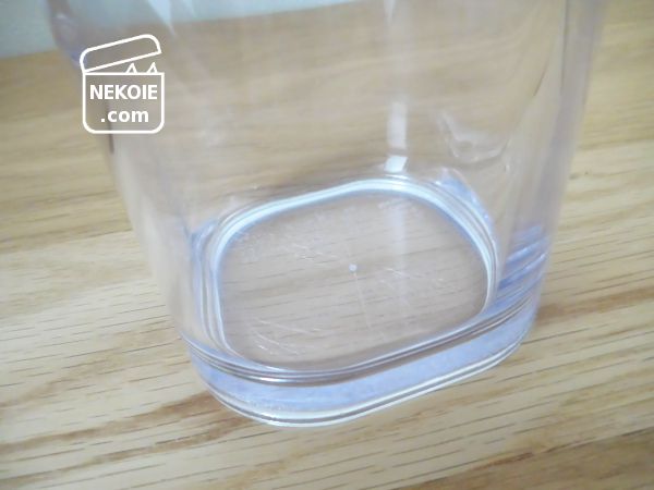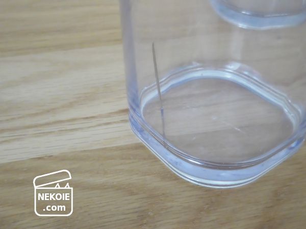 容器の底近くに見える線は、小傷と呼ぶには深くまで進行しきってしまった亀裂。最初は側面にうっすらと見える程度だったものが、とうとう角を越え底面にまで到達。