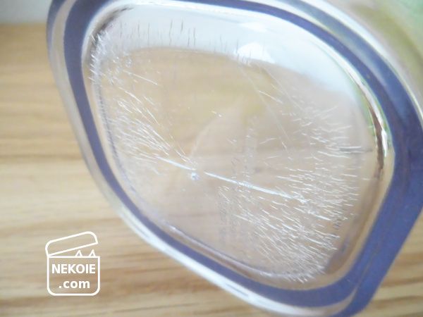 実は何かのきっかけでここ数年はアクリル素材だと思いこんでいたのですが、後からAS樹脂だと再確認しました。なおアクリル素材もアルコールには弱いそうです。いずれにしても最初は「アルコール使用不可」という条件を知らなかったものの、認識してからも同じ消毒方法を控えることはありませんでした。キッチンで食品(飲料)保存に使うのならばと、数年前から、とくにこの一年はしっかりめに、自己責任での消毒作業を続けていたんです。