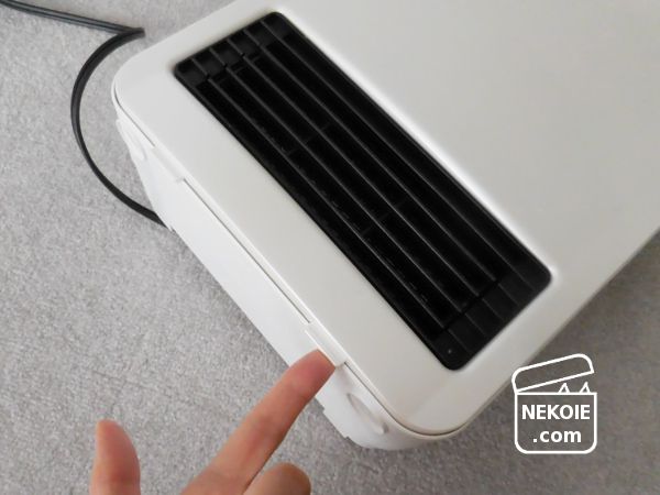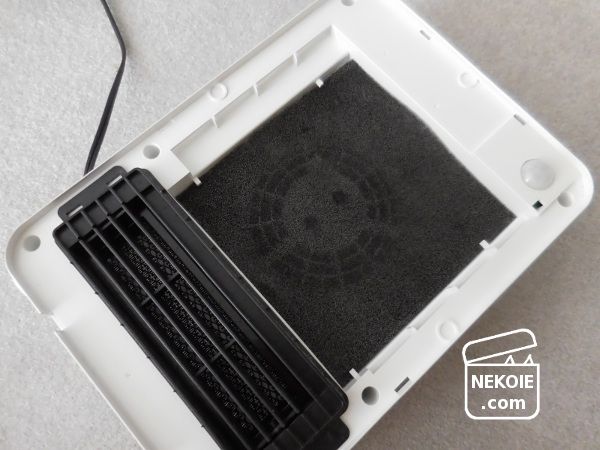 こちらは前面パネルを開ける(下部の突起に指をかけて持ち上げるだけ)とフィルターがあるのですが、ここにたまったほこりを掃除機で吸い、気になる部分を拭き掃除したらお手入れ完了。