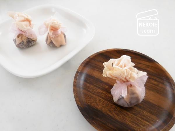 こういう包み方を自分でも取り入れてみたいです。長命寺(桜餅)の皮を使ってもよさそう。