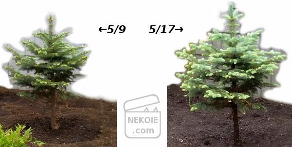 ただ「トウヒはモミの木ほど成長が早くない」「コンクリで固められた狭い花壇に植えるならそれほど成長しない」という話も聞いて、結局は鉢植えから地面に下ろしたのが四年ほど前のこと。