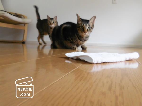 雑巾がけを始めると、鬼ごっこ感覚で追いかけてきます。