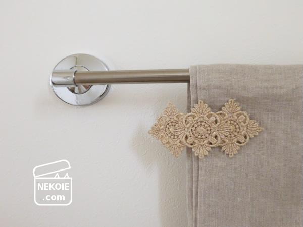 昔100円ショップで買った5~6個セットのカフェカーテンフックのひとつに使用後の濡れたタオルをはさんであります。洗濯直前に回収するまではここで干しておくことに。