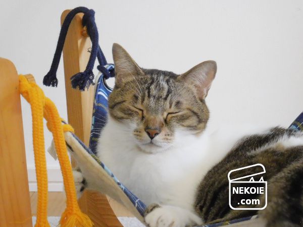 悠々とニャンモックをのりこなす弟猫ですが、次の瞬間……