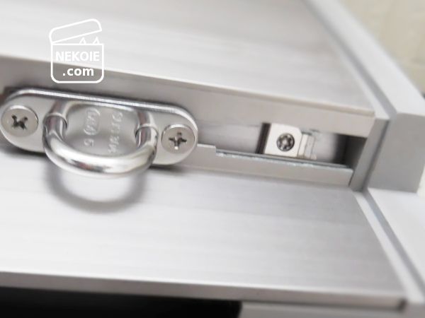 あとは窓の外側、一番端っこに開いたスペースから四角いプレートを押しこみ、レールに沿って滑らせ、固定したい場所でネジを締め直すだけ。途中に紛らわしい穴もありますが、端からでないと入りません。