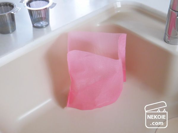 ちょうど竹炭を洗うのにスタンドタイプの排水ネット(上の写真は数年前のもの)も活用していたため、そこにつぶした爪とぎを入れてしまうことに。
