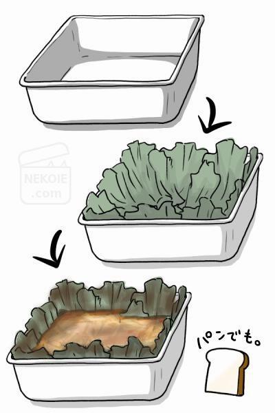 またグラタンなどを作るときも、うつわにキャベツなどを敷き詰めておくことでチーズの焦げつきもうつわには届きません。葉野菜は食べてしまえばいいので、洗い物が少し楽。