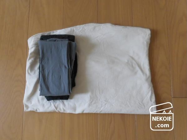 たとえばパジャマなどは数時間後には使うので、立ったままでもできるくらい簡単に、二つ(三つ)折りにしてセットで使う下着や靴下を間に忍ばせます。たたむというより「包む」感覚。