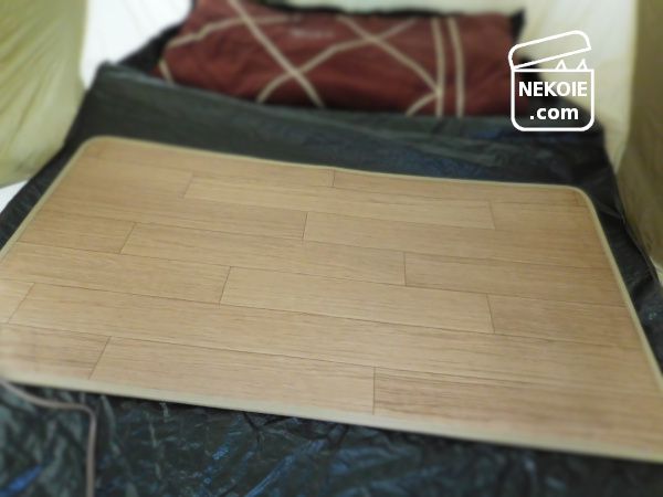 床面のシートがしわしわですが、これは猫たちの体重で一冬かけて伸ばしてもらいます。そして改めてテントの中に件のホットマットを敷きました。