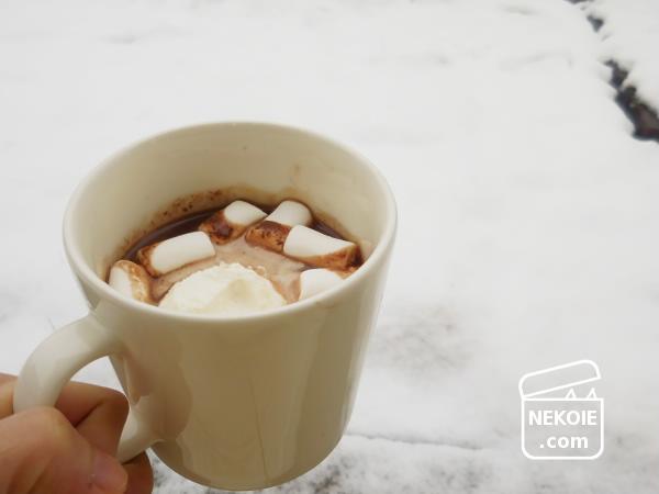 マシュマロ&生クリーム載せを飲んだあと、午後からは一時間ほど玄関前とエアコンの室外機周辺だけ雪かきをして、ついでの雪遊び。