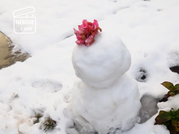 家の周りをぐるぐるしてみたものの目鼻に使える小石などが見つからなかったので、裏庭で拾った(落ちていた)椿の花を髪飾り代わりに載せてみました。
